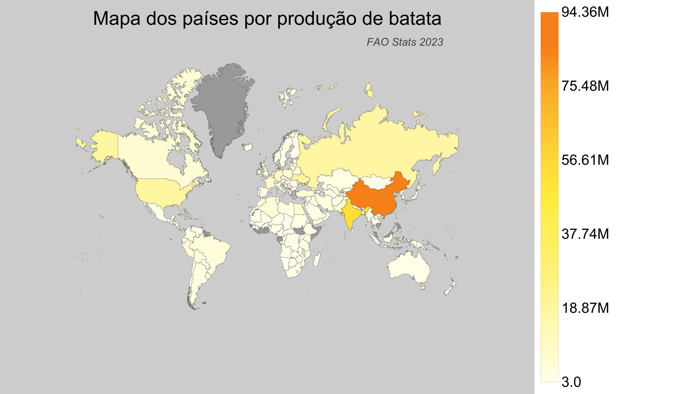 A batata é um dos alimentos básicos mais consumidos no mundo, desempenhando um papel crucial na segurança alimentar global. É cultivada amplamente em regiões de clima temperado, exigindo solos bem drenados e uma quantidade moderada de chuva. Este relatório apresenta dados do ano de 2023, com base na base de dados da Organização das Nações Unidas para a Alimentação e Agricultura (FAO), atualizados até 2025.