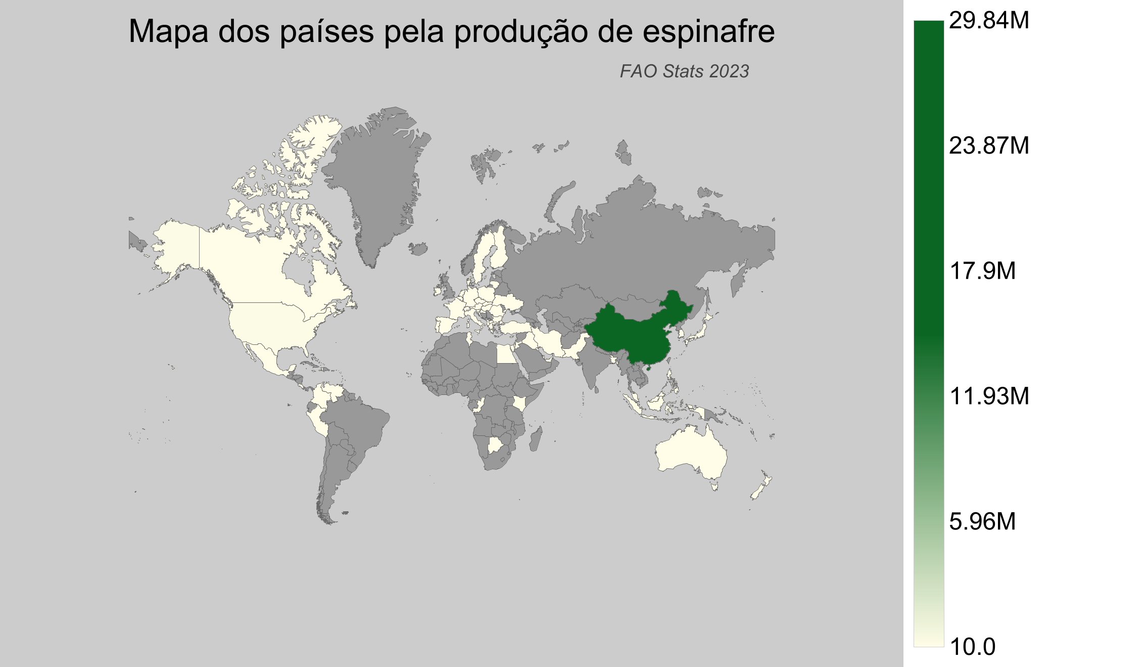 - China: Impressionantes 29.8 milhões de toneladas de espinafre em 2023, consolidando a sua posição como líder absoluto na produção mundial.