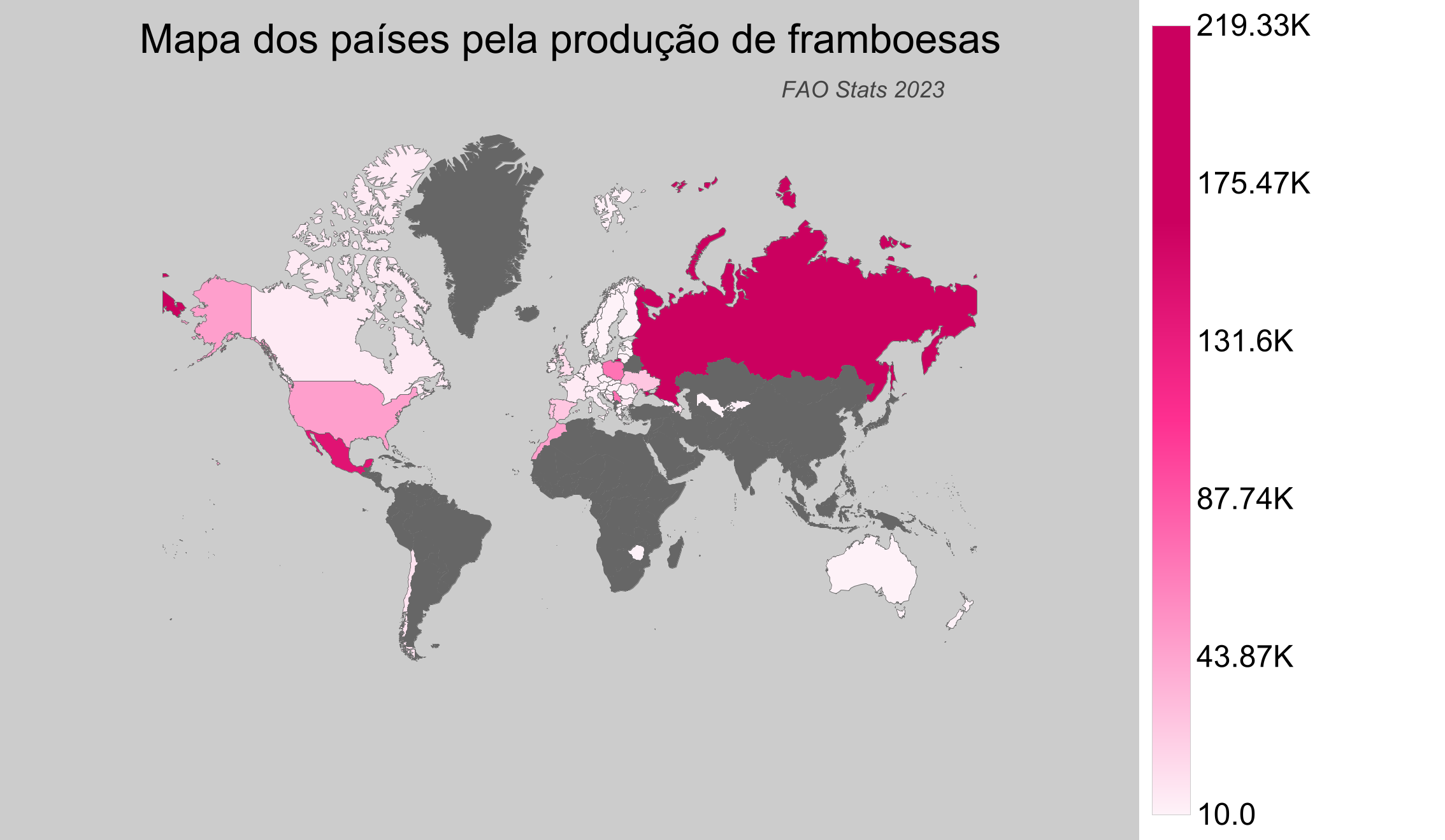 - Federação Russa: Aproximadamente 219 mil toneladas de framboesas colhidas em 2023.