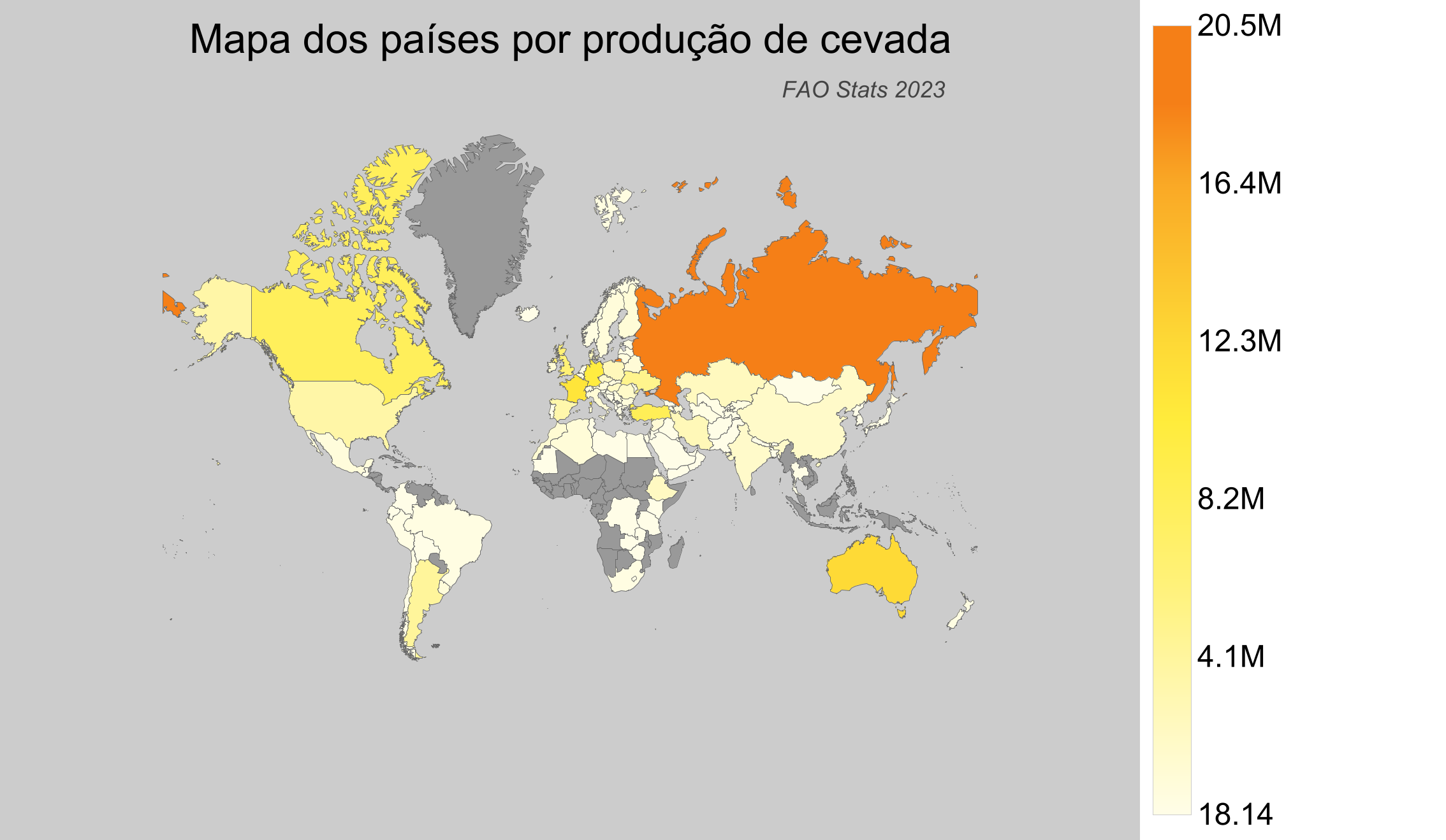 A cevada é um grão essencial para a alimentação humana e animal, além de ser um componente vital na produção de bebidas como cerveja e whisky. Cresce em climas temperados e subtropicais, adaptando-se a várias regiões ao redor do mundo. Este relatório fornece uma visão abrangente da produção mundial de cevada para o ano de 2023, com base nos últimos dados disponíveis no banco de dados da Organização das Nações Unidas para Agricultura e Alimentação (FAO) em 2025.