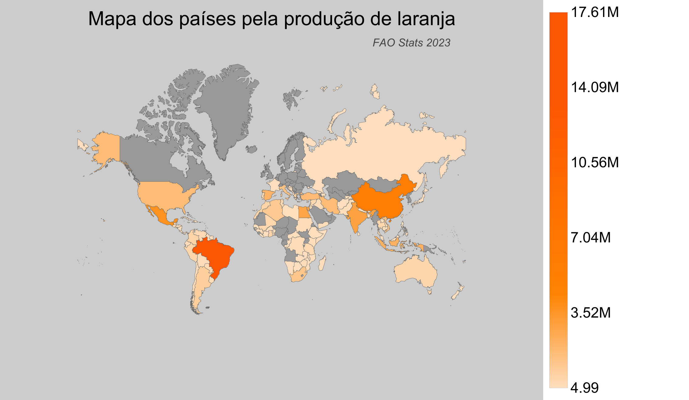 - Brasil: Representa cerca de 25% da produção global de laranjas, dominando claramente o cenário mundial de produção.