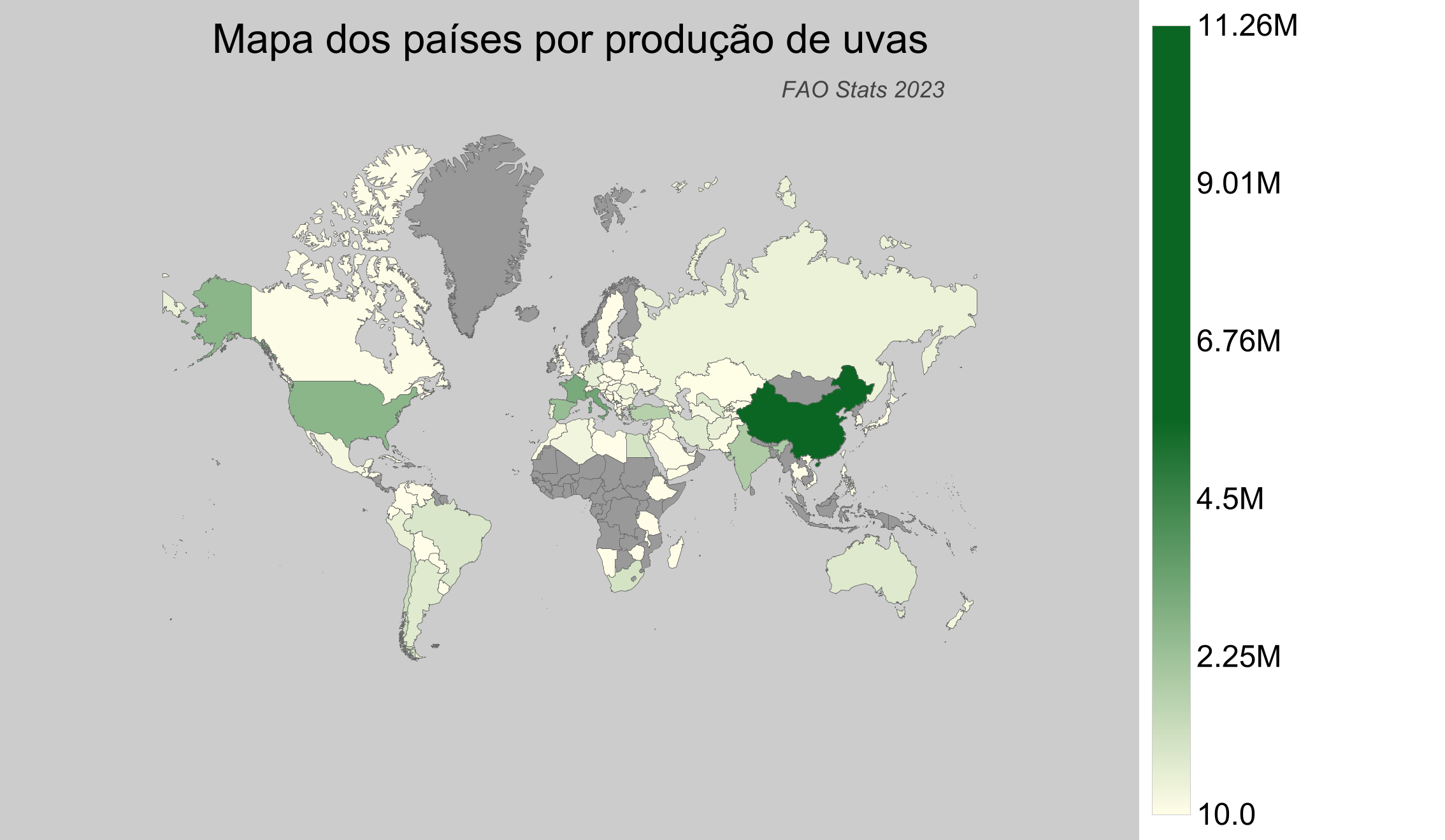 - Juntos, esses países representam uma parte significativa da produção mundial de uvas, mostrando a intensidade da produção concentrada em algumas nações.