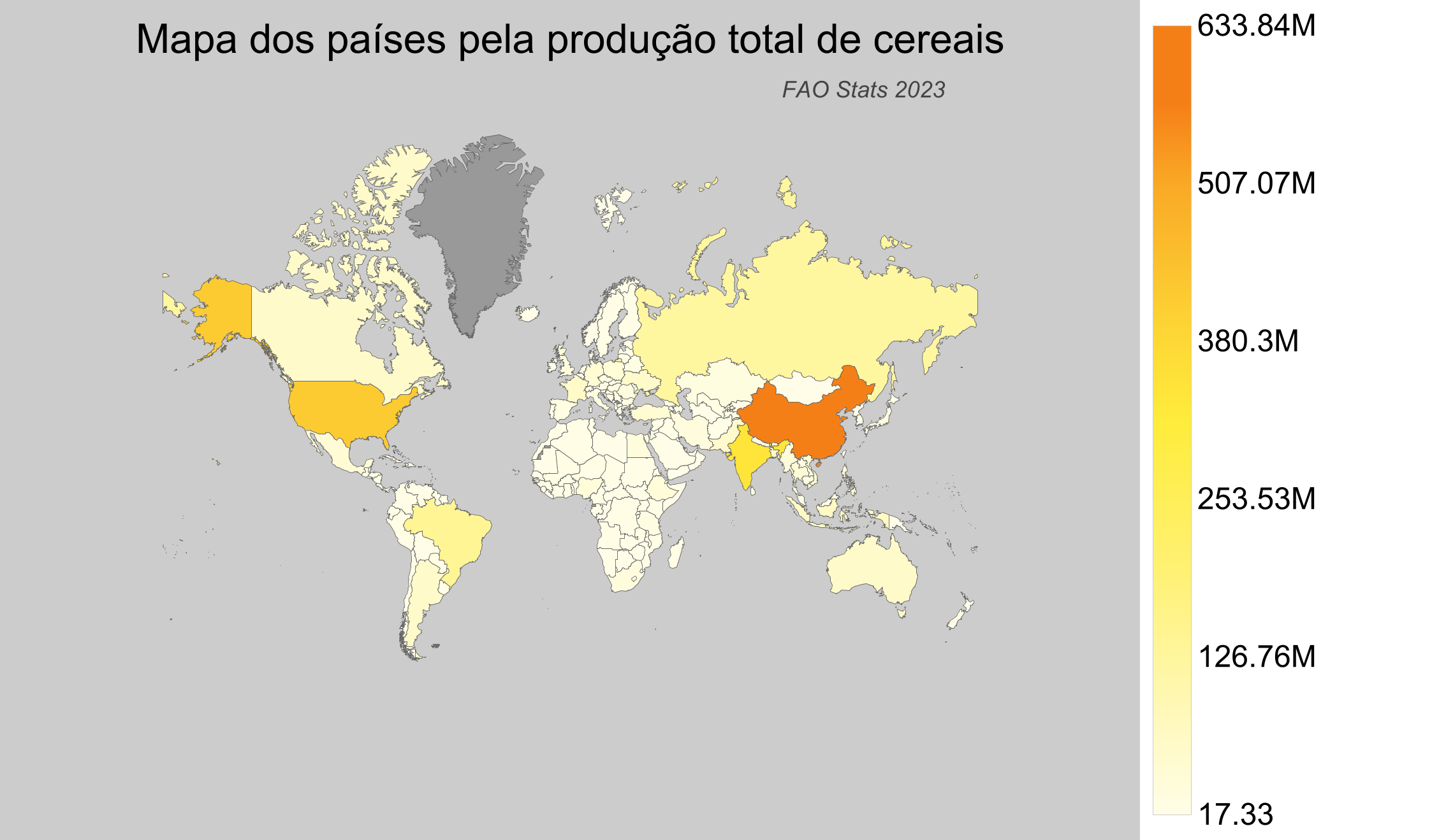 - China é o líder de produção de cereais, com cerca de 634 milhões de toneladas em 2023.